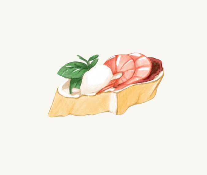 тигровая креветка, итальянские травы, черри, фирменный соус "Цезарь", багет